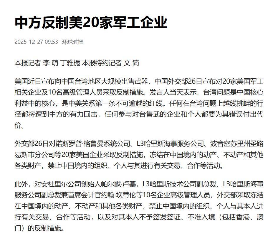 近年来,台海局势不太平,台当局挑起了多次针对中国的行动。例如,台湾地区的高市早苗政府不断在台湾问题上挑衅,而美国在特朗普政府时期不顾中方强烈反对,再次对台进行大规模军售。这次军售金额高达111亿美元,创下历史新高。在美国和日本的不断挑衅下,中方采取了相应反制措施。针对日本,中国不仅通过外交手段反击,还采取了实质性的经济打击,尤其是重创了日本的旅游业。与此同时,对于美国,中国则发出了30道通牒,并对20家军工企业和10名幕后推手进行了制裁,反响强烈。