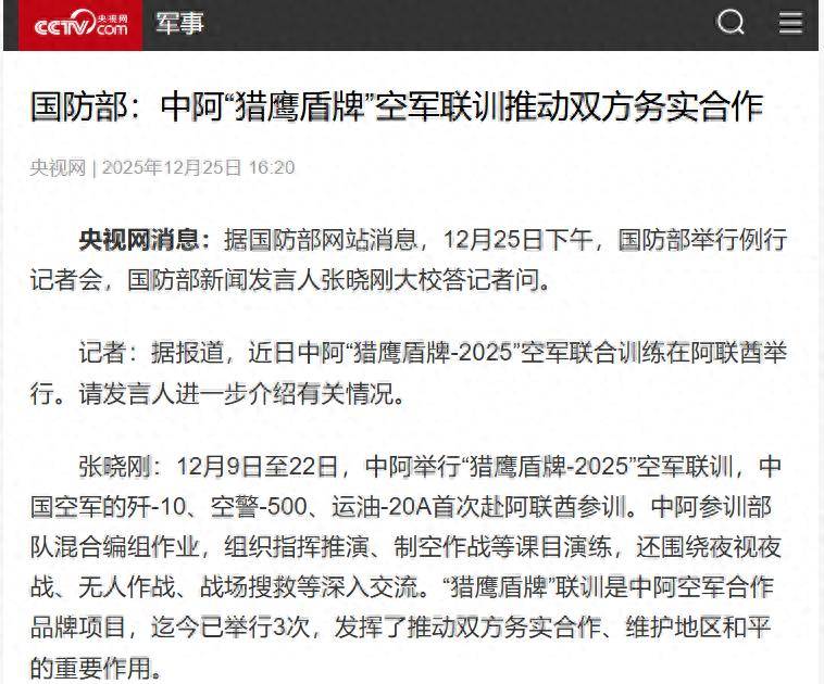 除了这些外交反制,中方还通过实际行动展示了中国空军的强大。12月25日,在国防部例行记者会上,发言人张晓刚大校透露,中国空军于12月9日至12月22日派遣歼-10、空警-500和运油-20A前往阿联酋,与阿联酋空军共同进行猎鹰盾牌-2025联合空军训练。这一消息的公布,意味着中国空军不仅走出了国门,而且是首次大规模、有计划地开展这样的联合训练,体现了中国空军能力的提升。