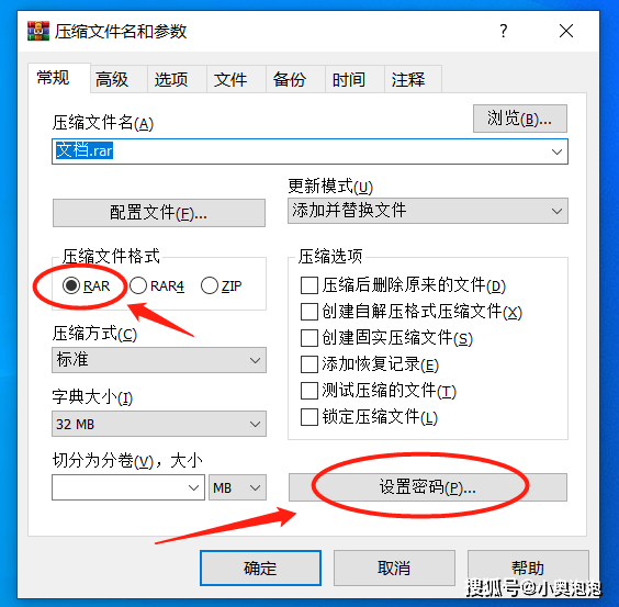 2、弹出对话框后,压缩格式选择“RAR”,然后点击【设置密码】。