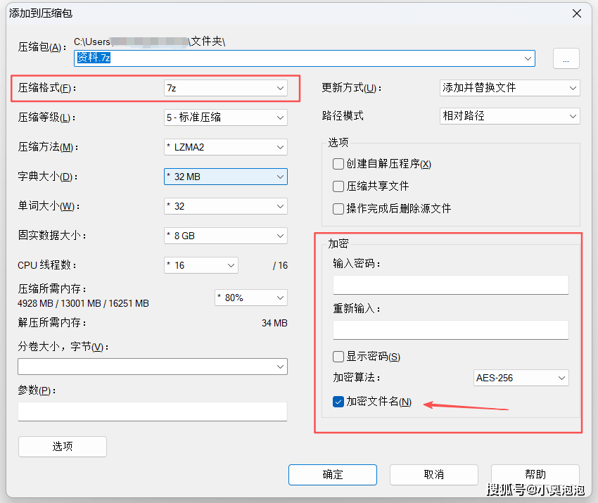 2、弹出对话框后,压缩格式选择“7Z”,然后在“加密”区输入密码,同时记得勾选“加密文件名”,完成后,点击【确定】即可。