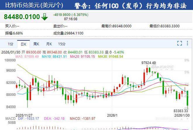 1月29日,比特币价格跌破85000万美元关口,盘中一度大跌6.8%,一度触及83383.33美元。截至发稿,报84480美元,跌幅5.39%。