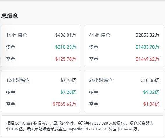 coinglass数据显示,24小时加密货币全网共有超22万人爆仓,10.06亿美元(约合人民币70亿元)灰飞烟灭。