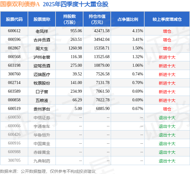 国泰双利债券A的前十大重仓股如下:
