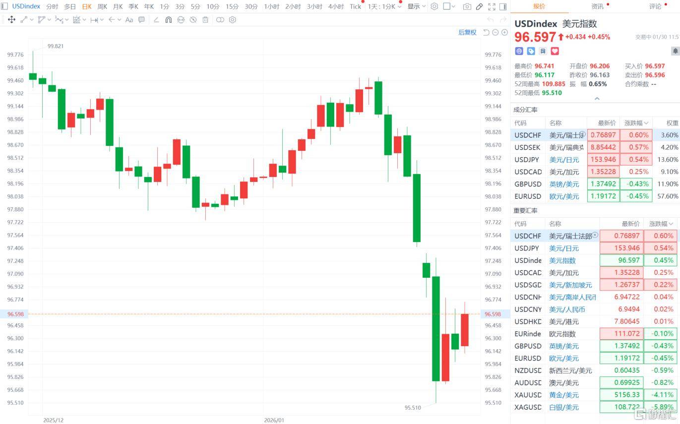 截至发稿,美元指数涨幅扩大至近0.5%报96.597,美元对日元上涨超0.5%至153.946。