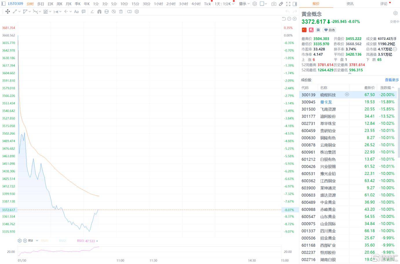 A股黄金股大面积跌停,晓程科技、萃华珠宝、铜陵有色、江西铜业、白银有色、中金黄金、赤峰黄金、莱绅通灵、四川黄金、招金黄金等多股跌停。
