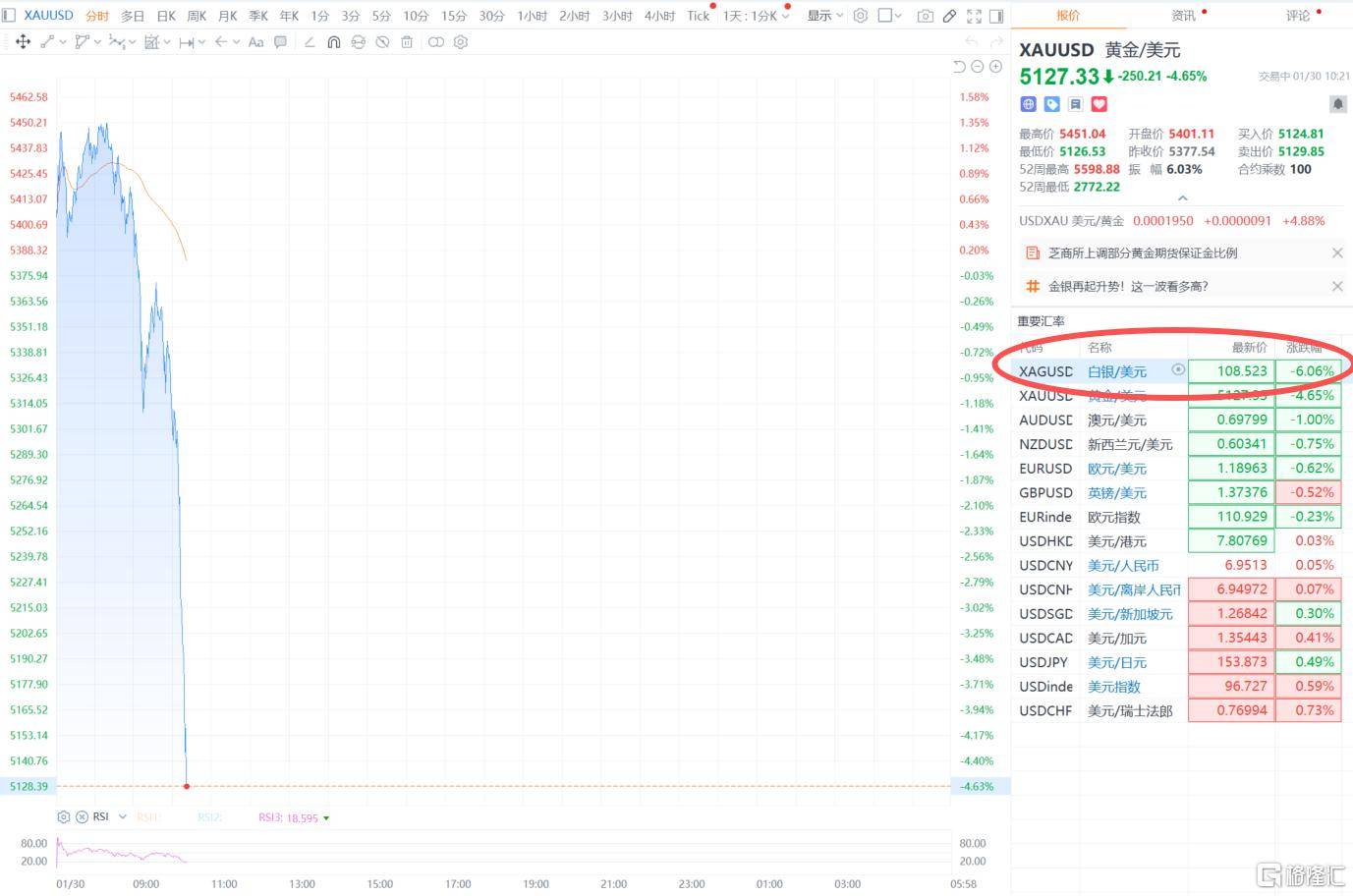 现货白银跌势更猛,盘中一度暴跌超6%失守108美元,现报108.523美元/盎司。