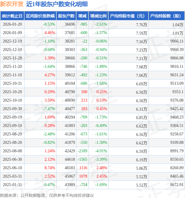 从股价来看,2026年1月9日至2026年1月20日,新农开发区间跌幅为0.53%,在此期间股东户数减少985.0户,减幅为2.61%。