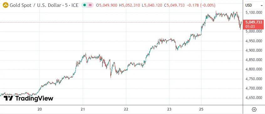 本周一国际金价延续近期的强势上涨态势,再创历史新高,现货黄金连续突破5000美元、5100美元两道大关。