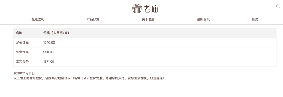 1月31日,老庙报1546元/克,相较于1月30日的1690元/克,一夜跌了144元/克。老凤祥报1498元/克,相较于1月30日的1668元/克,下跌170元/克。周大福报1625元/克,相较于1月30日下调60元/克,两日下调81元/克。