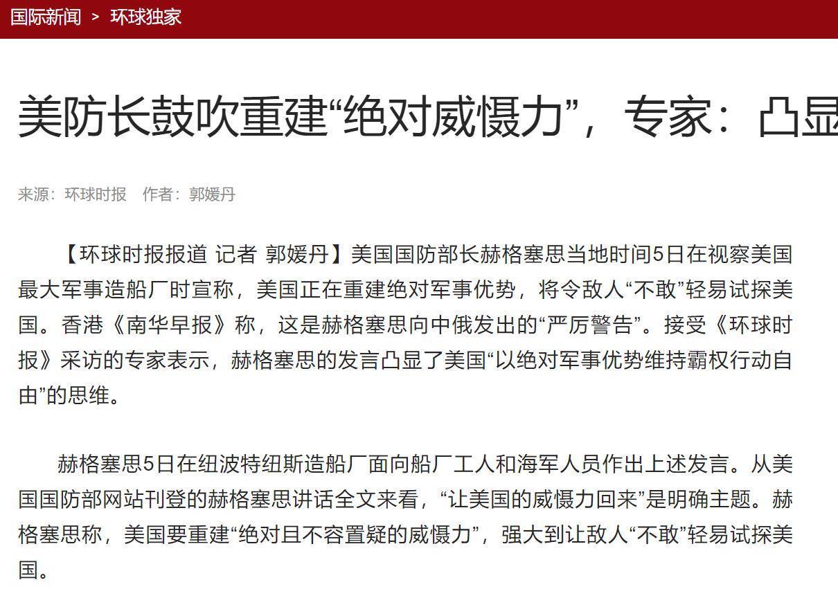 美防长赫格塞思一直宣称美国不寻求与中国发生冲突,但自从美军在委内瑞拉的军事行动之后,他的态度明显发生了变化,开始有些得意忘形,大放厥词称美国已为潜在的冲突做好准备。他甚至威胁,如果有人敢对美军舰船开第一枪,他们将见不到明天的太阳。然而,赫格塞思发出的这些战争言辞,真的是美军实力所能支撑的吗? 据《南华早报》报道,在美军两天前绑架了委内瑞拉总统马杜罗之后,赫格塞思向全球发布了战书,表示任何挑战美国权威的行为,都将付出代价。赫格塞思宣称,通过对胡塞武装、伊朗和委内瑞拉的军事行动,美国已经重建了所谓的绝对威慑力,并且强大到任何敌人都不敢轻易挑战美国。他还强调,尽管世界正进入超级大国对抗的新时代,美国致力于与中国等国家建立良好关系,但同样也为可能发生的冲突做好了万全准备,时刻保持着最强战备状态。