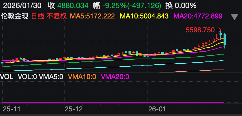 除了“杰我睿”事件,国际金银价格剧烈震荡也引起市场关注。北京时间1月31日凌晨,黄金白银等贵金属“高台跳水”。以黄金为例,现货黄金在1月29日首次突破每盎司5500美元大关,但在一度逼近5600美元关口后出现下跌。1月30日,现货黄金加速下跌,跌至每盎司4900美元下方。