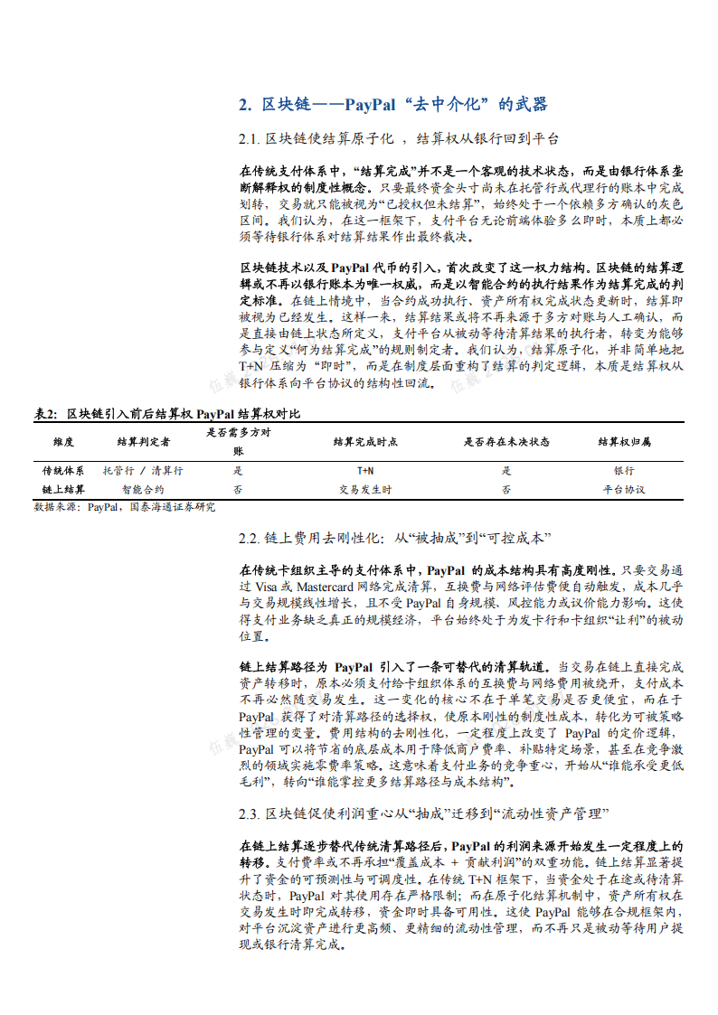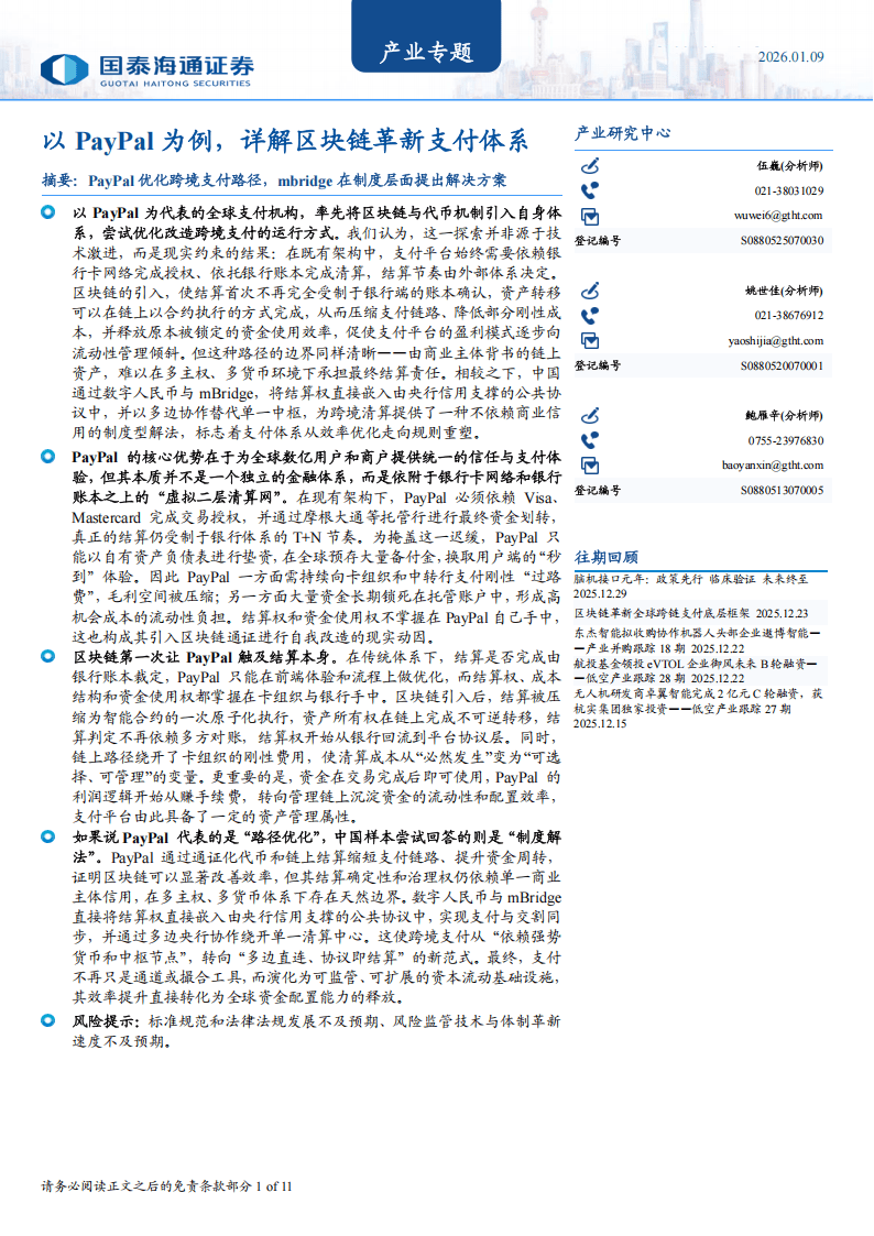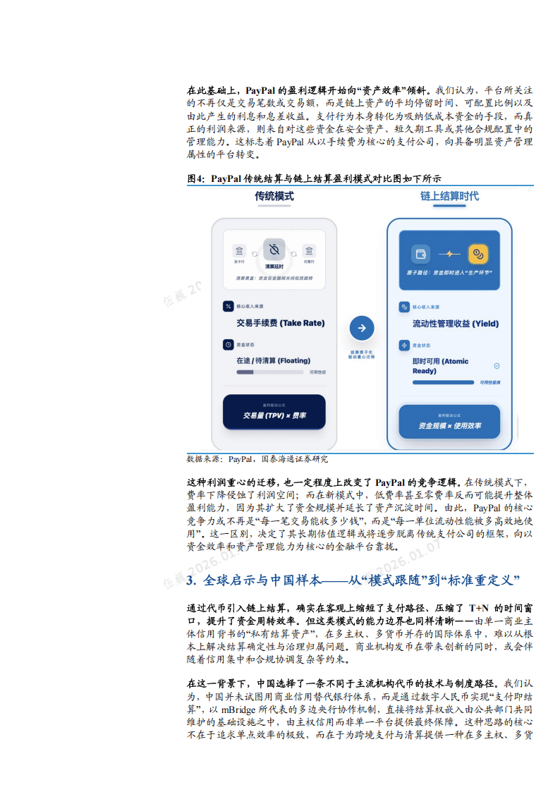 国泰海通证券2026年1月发布的产业专题报告,以PayPal为例深入剖析了区块链技术对全球支付体系的革新作用,并呈现了不同路径的探索成果。