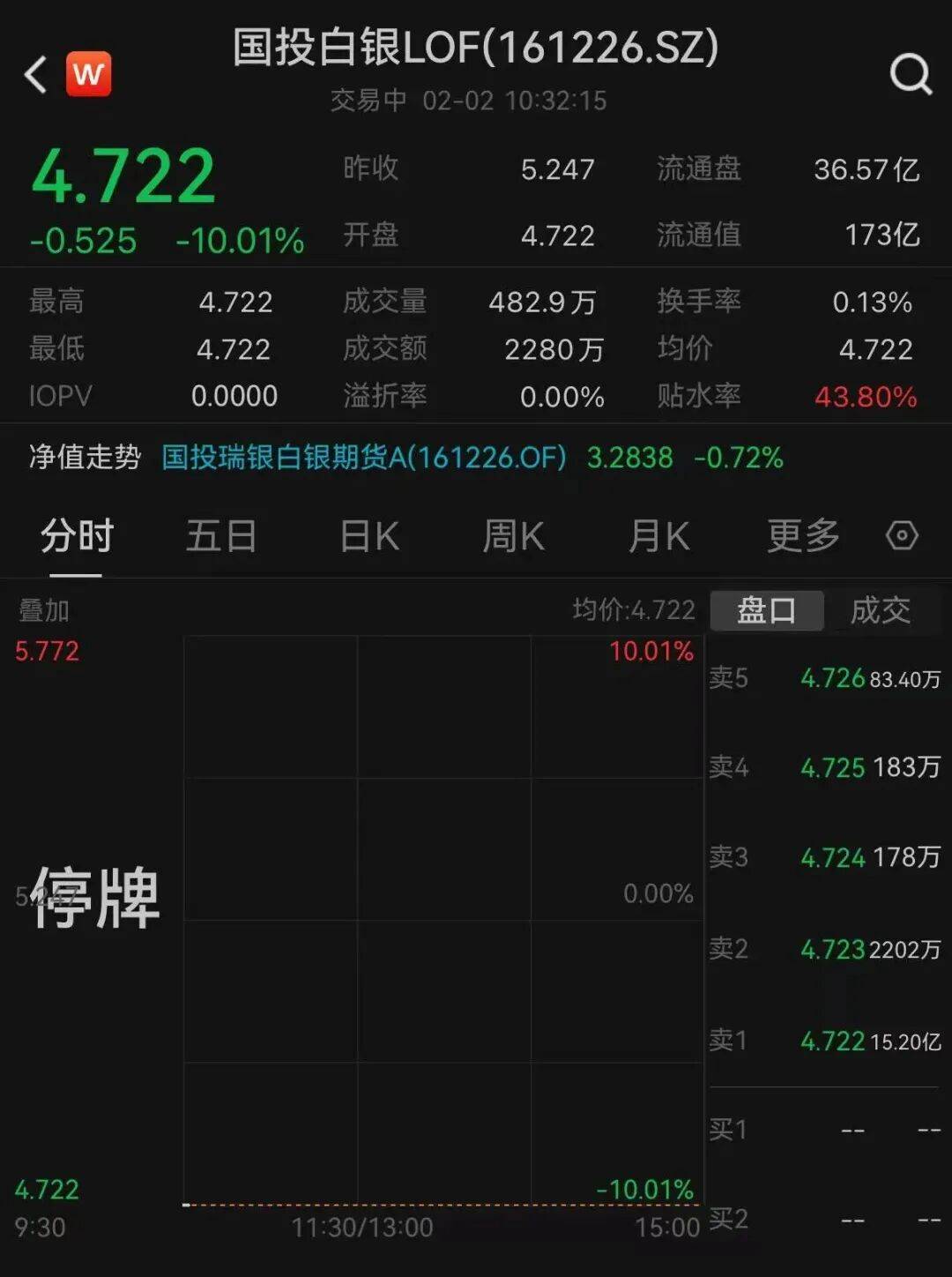 2月2日,国投白银LOF复牌跌停,贴水率(溢价率)收窄至43.8%。