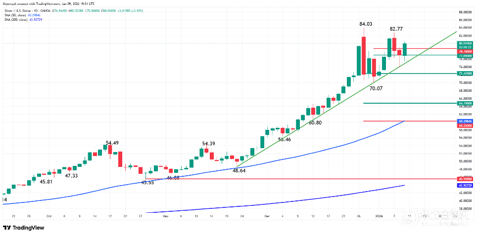 【华通白银网1月12日】•银价在突破80美元后飙升3.56%,多头瞄准阻力位82.77美元和历史高点84.03美元。