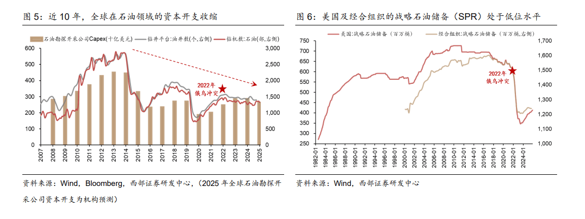 逻辑四:供需格局有望改善。库存端,原油市场正处库存历史低位。供给端,过去 10 年里,全球在石油供给端上的资本开支投入呈收缩趋势。