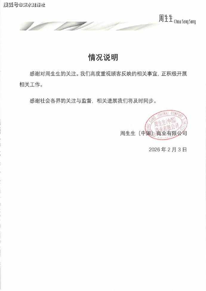 2月3日,周生生官方微博回应称,“高度重视顾客反映的问题,正积极开展相关工作,感谢社会监督,后续进展将及时公布。”