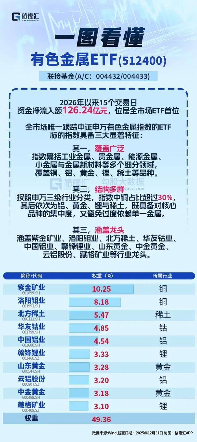 2026年以来,仅15个交易日,有色金属ETF(512400)获得126.24亿元资金净流入,位居全市场ETF首位。