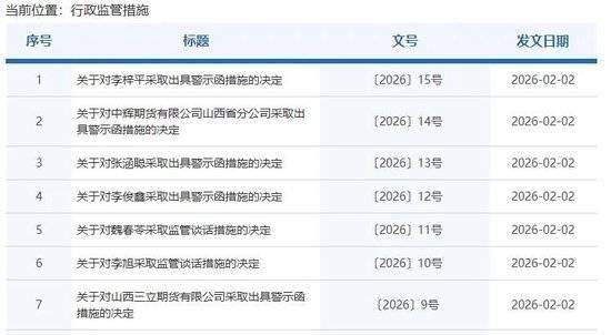 2月2日,山西证监局同步发布7份监管公告,对山西三立期货、中辉期货山西省分公司的违规行为作出处理。两家机构均被采取出具警示函的监管措施,中辉期货山西省分公司1名负责人及山西三立期货4名核心管理人员同步被问责。