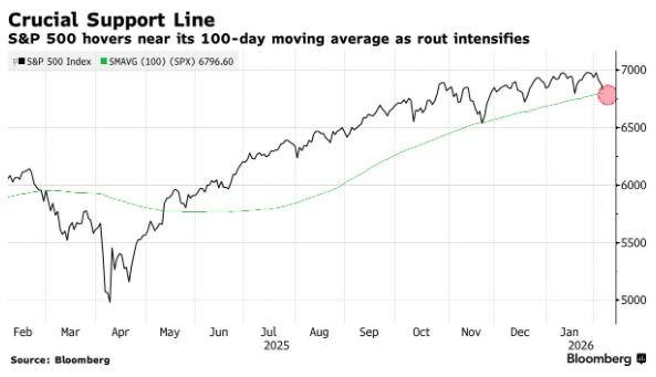 “标普500指数在去年11月曾从该线位强劲反弹,” Miller Tabak & Co.首席市场策略师马特·马利指出,“因此,如果此次有效跌破该线,将亮起一些警示信号。”他补充道,对图表观察者而言,持续跌破100日均线将标志着市场趋势的转变——此前市场在2025年4月因关税引发的抛售触底后一直稳步攀升。