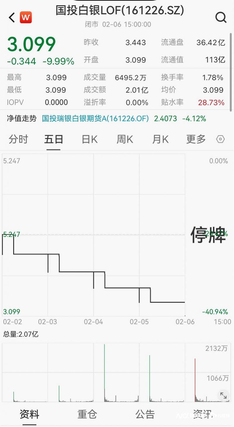 受估值调整事件的持续影响,2月2日至6日期间,国投白银LOF场内价格已连续5个交易日出现“一字跌停”,单周累计大跌40.94%,该基金最新场内价格报3.099元/份。