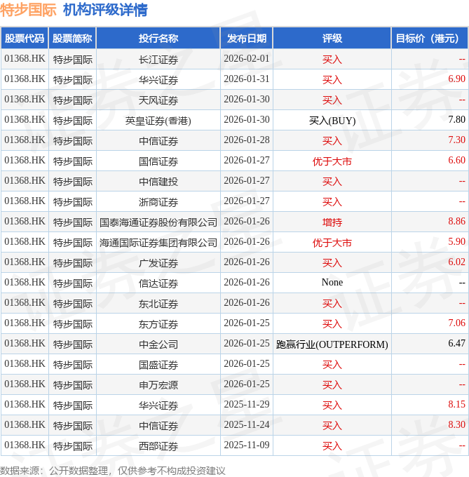 截至2026年2月6日收盘,特步国际(01368.HK)报收于5.2港元,下跌0.76%,成交量823.35万股,成交额4275.7万港元。投行对该股的评级以买入为主,近90天内共有14家投行给出买入评级,近90天的目标均价为7.21港元。长江证券最新一份研报给予特步国际买入评级。