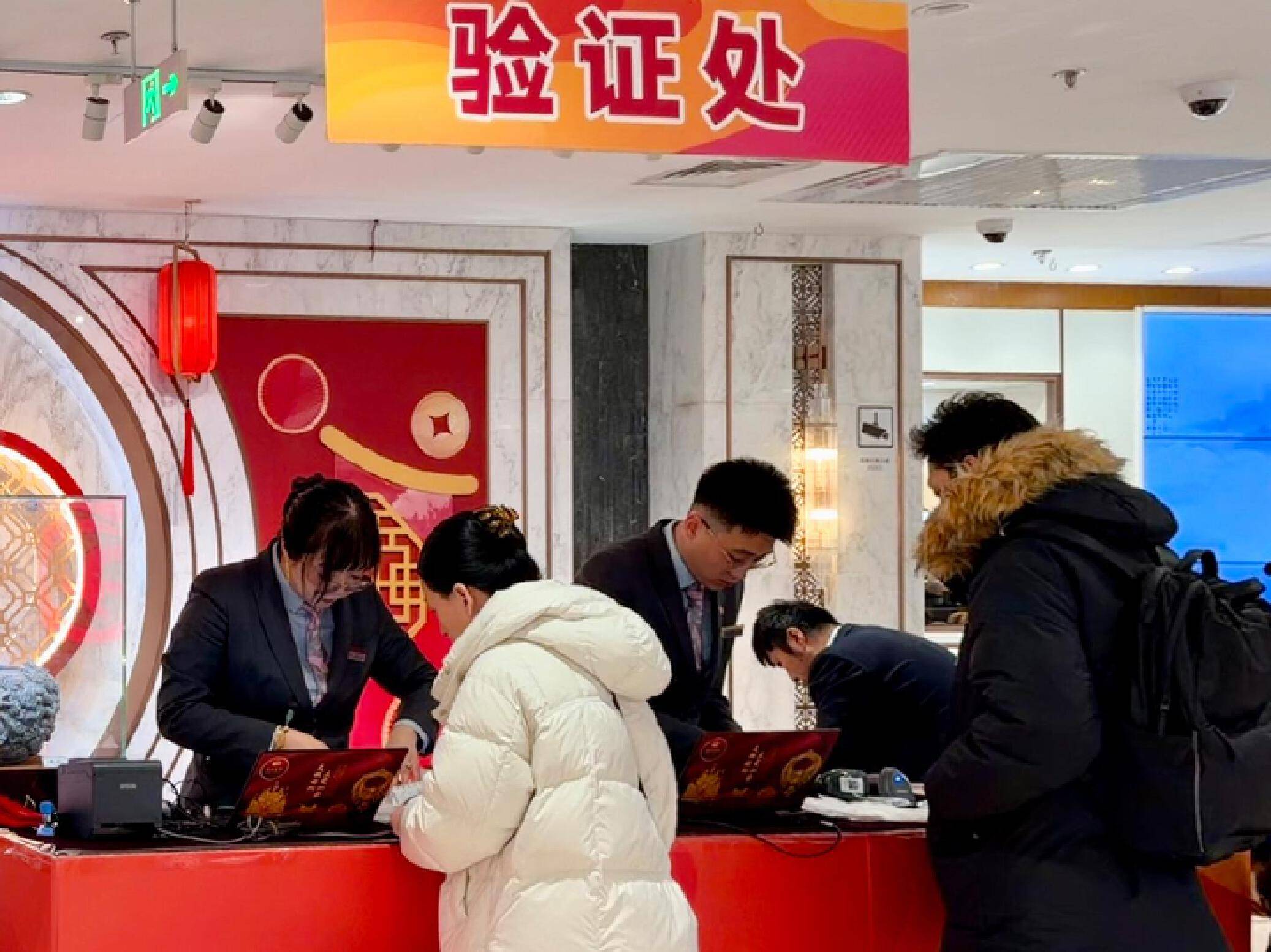 菜百首饰的三层原本主营翡翠和珊瑚饰品,四层才是投资金的交易处,但最近卖金的人太多,黄金回购业务从四层搬到三层,临时搭起了“验证处”。上午10点,回购处在开店半个小时后迅速排成长队,工作人员在队末举着“回购业务验证队尾”的牌子,热闹景象不亚于四层的购金处。