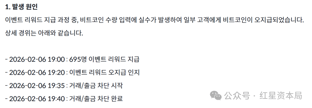 Bithumb事后发布的复盘公告显示,活动开始后经过20分钟发现“发的是比特币”,然后又花了15分钟启动阻止相关账户交易/提币的程序,到19点40分完成突发情况的处置。