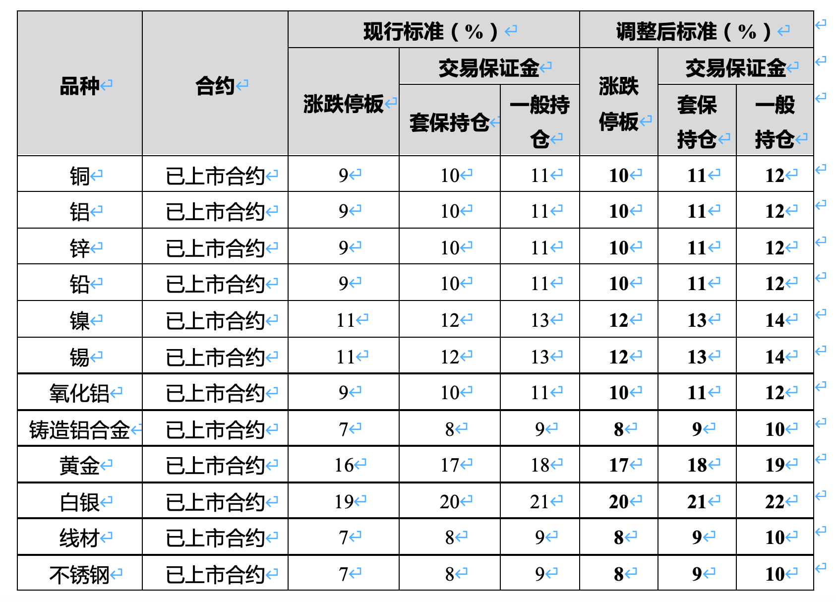 在有色金属方面,铜、铝、铅、锌、氧化铝期货已上市合约的涨跌停板幅度调整为10%,套保持仓交易保证金比例调整为11%,一般持仓交易保证金比例调整为12%;铸造铝合金、线材、不锈钢期货已上市合约的涨跌停板幅度调整为8%,套保持仓交易保证金比例调整为9%,一般持仓交易保证金比例调整为10%;镍、锡期货已上市合约的涨跌停板幅度调整为12%,套保持仓交易保证金比例调整为13%,一般持仓交易保证金比例调整为14%。