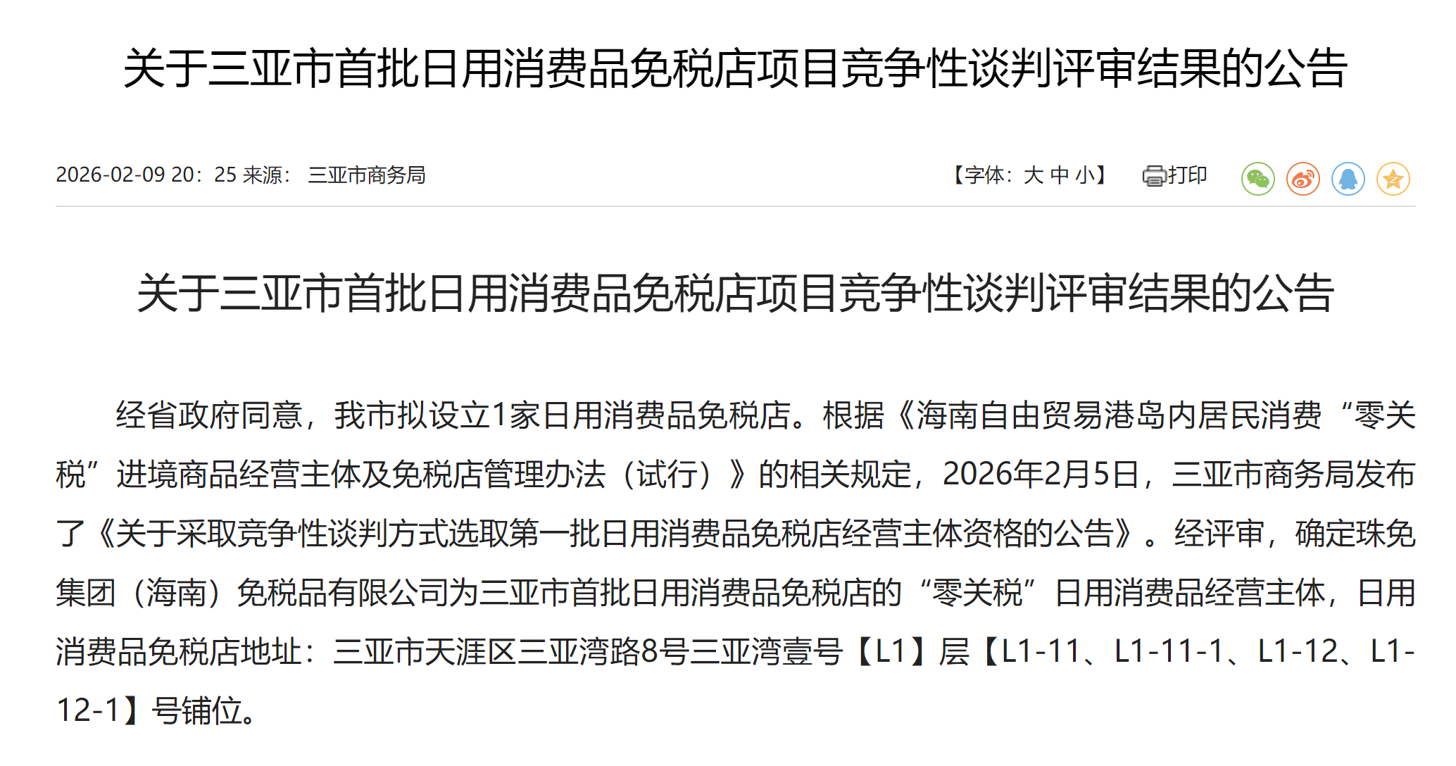 上证报中国证券网讯(记者 黎灵希)2月9日,三亚市商务局发布《关于三亚市首批日用消费品免税店项目竞争性谈判评审结果的公告》。当中提到,经评审,确定珠免集团(海南)免税品有限公司为三亚市首批日用消费品免税店的“零关税”日用消费品经营主体,日用消费品免税店地址:三亚市天涯区三亚湾路8号三亚湾壹号【L1】层【L1-11、L1-11-1、L1-12、L1-12-1】号铺位。