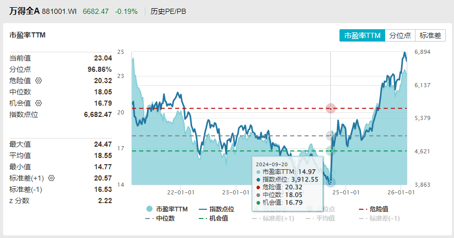以万得全A指数为参考,2024年9月至今,指数点位从3900点上升至当前6680点,涨幅约70%;同期,指数PE估值从15倍上升至当前的23倍,幅度约54%。简单来讲,本轮上涨主要是拔估值,约16%才是业绩贡献。