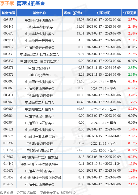 李子家先生:中国国籍,中国人民大学本科,金融学硕士。2016年5月至2020年8月历任中信建投基金交易部交易员、投资部-固收投资部基金经理助理;2020年9月至2022年8月任华夏理财固定收益投资部投资经理。2022年8月加入中加基金管理有限公司,任中加中债-1-5年政策性金融债指数证券投资基金基金经理。2022年11月15日至2024年5月9日担任中加心悦灵活配置混合型证券投资基金、中加瑞合纯债债券型证券投资基金基金经理。2022年12月5日任中加穗盈纯债债券型证券投资基金的基金经理。2023年3月29日至2025年7月9日担任中加瑞鸿一年定期开放债券型发起式证券投资基金基金经理。2023年7月12日起担任中加颐信纯债债券型证券投资基金基金经理。2022年11月15日至2024年1月2日担任中加中债-1-3年政策性金融债指数证券投资基金基金经理。现担任中加颐瑾六个月定期开放债券型发起式证券投资基金基金经理。