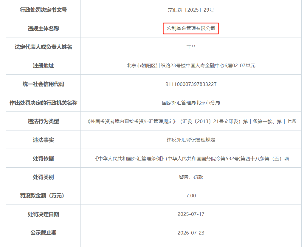 近日,国家外汇管理局北京市分公布行政处罚决定,对宏利基金管理有限公司(下称“宏利基金”)违反外汇登记管理规定行为作出警告并罚款7万元的处罚。该处罚依据《中华人民共和国外汇管理条例》第四十八条第五项,涉及《外国投资者境内直接投资外汇管理规定》(下称《规定》)第十条第一款及第十七条的违规操作。