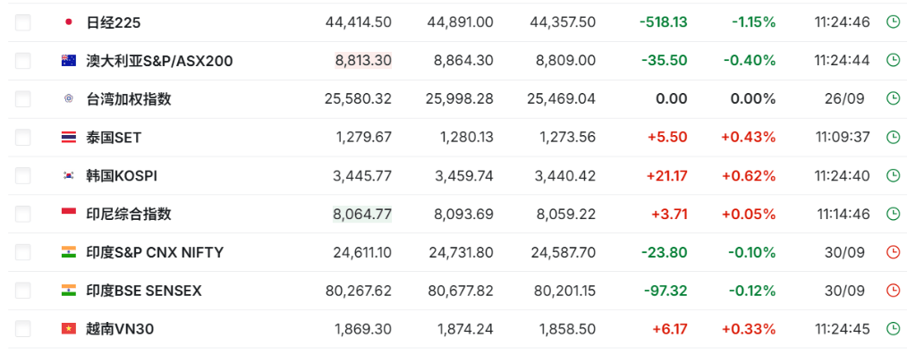 日本日经225指数在经历了前一个季度的强劲上涨后,今日一度下跌1%,东证指数也下跌1.69%。澳大利亚S&P/ASX 200指数小幅下滑0.4%。