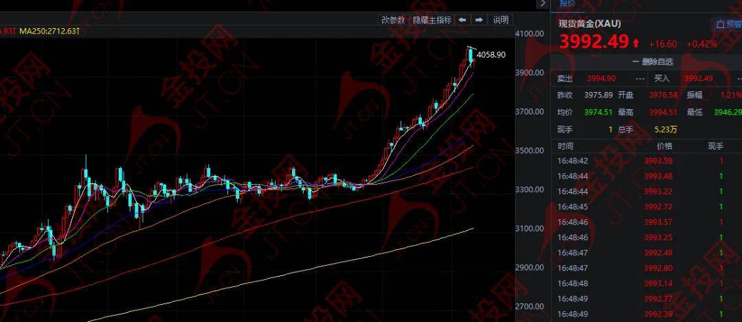 隔夜,现货黄金收盘暴跌65.53美元,跌幅1.62%,最终收报于3976.04美元。今日亚市盘中,黄金短线突然快速下滑,最低跌至3946.29美元,目前在3993美元附近徘徊。