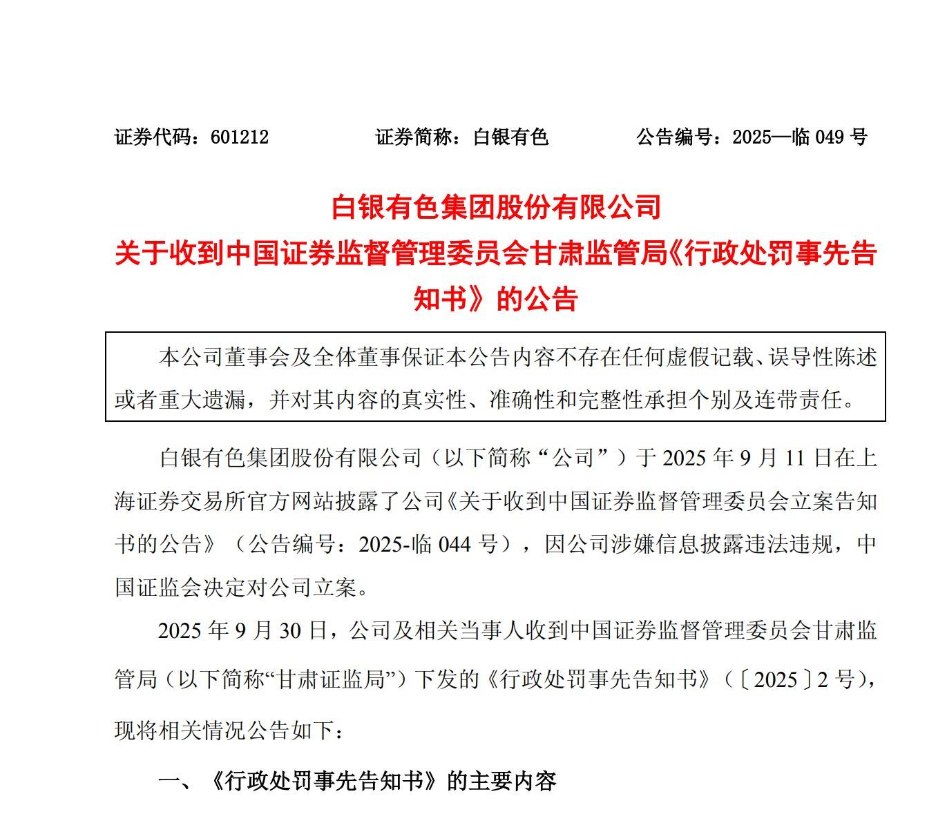 2025年10月1日,白银有色集团股份有限公司(公司或白银有色)披露,收到中国证监会甘肃监管局下发的《行政处罚事先告知书》。