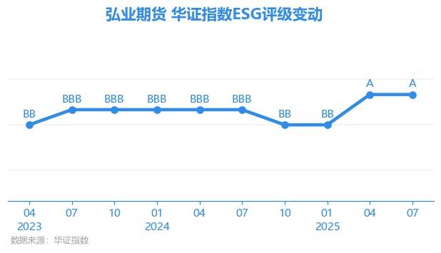 日前,华证指数公布了新一期(2025年7月31日)的ESG评级结果,弘业期货(001236.SZ)获得A评级(华证指数评级为C起至AAA九档,C为最低档,AAA为其最高一级评级/AA为其第二档),上一期(2025年4月30日)ESG评级为A。本期ESG评级在53家资本市场行业A股上市公司中排名第20(上一期排名第17)。