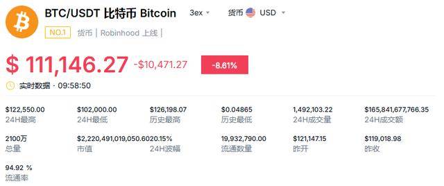 比特币一度大跌13%,跌破110000美元。截至今日9时58分,过去24小时内下跌8.61%。根据Coinglass的数据,过去24小时内,约有100亿美元的加密押注被清空,为至少自今年4月初以来最大的一轮强制平仓浪潮。