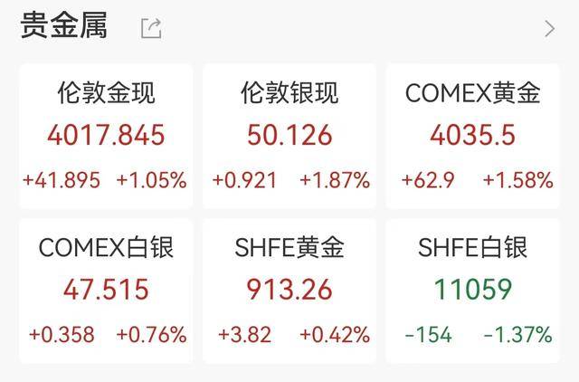 国际贵金属期货普遍收涨,COMEX黄金期货涨1.58%报4035.50美元/盎司,伦敦金现涨1.05%,报价双双再次来到4000点。COMEX白银期货涨0.76%。