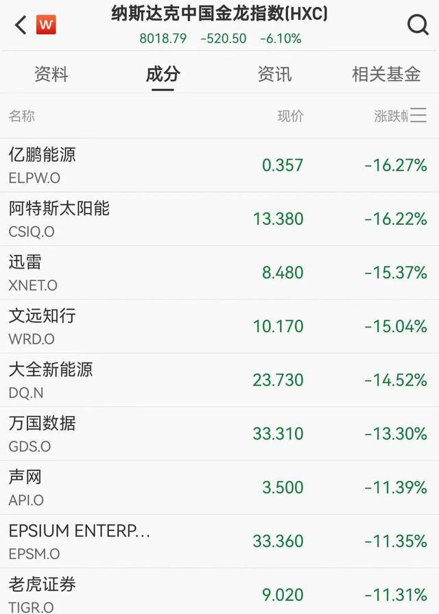 纳斯达克中国金龙指数收跌6.1%,热门中概股普跌,蔚来金山云跌超10%,哔哩哔哩跌超9%,百度、阿里巴巴、小鹏汽车跌超8%,京东跌超6%。