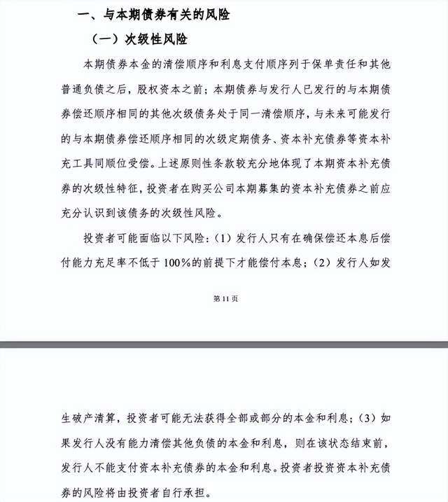此外,投资者可能面临三大风险,一是发行人只有在确保偿还本息后偿付能力充足率不低于100%的前提下才能偿付本息;二是发行人如发生破产清算,投资者可能无法获得全部或部分的本金和利息;三是如果发行人没有能力清偿其他负债的本金和利息,则在该状态结束前,发行人不能支付资本补充债券的本金和利息。投资者投资资本补充债券的风险将由投资者自行承担。