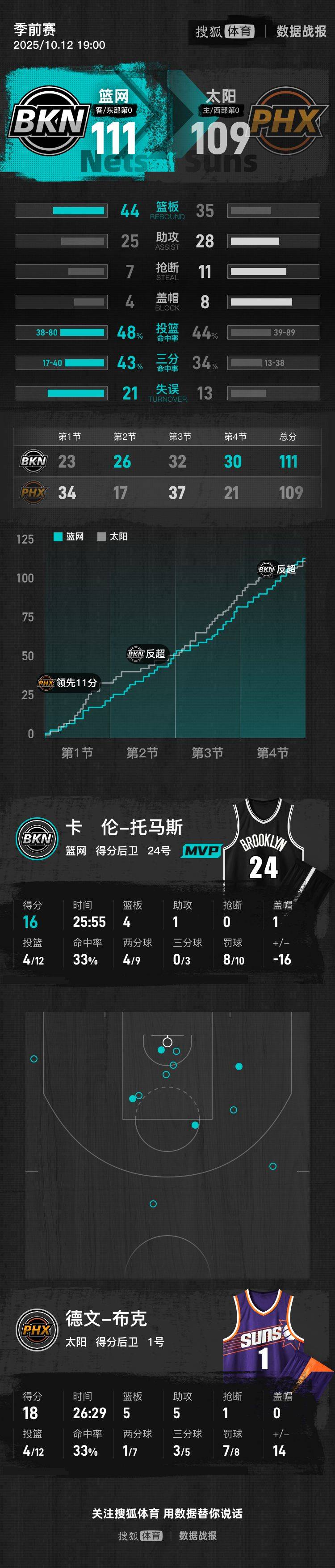 季前赛-托马斯16分布克18+5+5 曾凡博未出场篮网险胜太阳