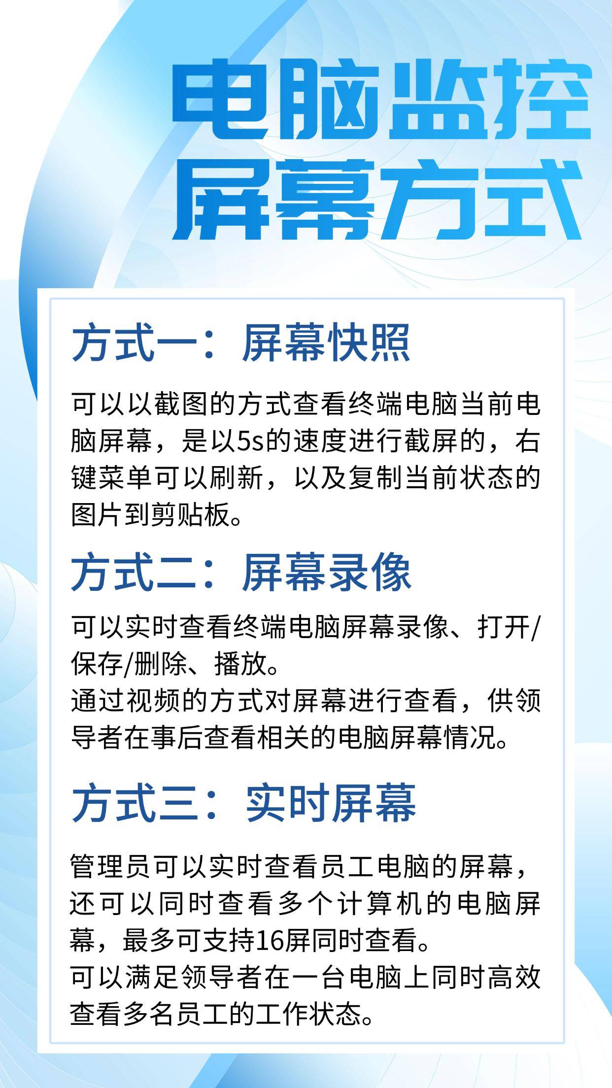 提供了屏幕快照功能,可以以屏幕照片的形式实时记录电脑屏幕上的内容。管理者可以随时查看和刷新这些快照,以便捕捉和保存重要时刻的屏幕图像。