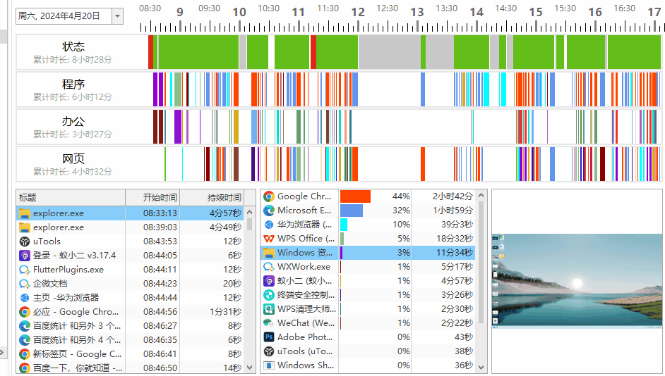 它可以帮助企业管理者了解员工在工作时间内和工作时间外的电脑使用情况,包括员工的工作效率、加班情况、休息时间等。