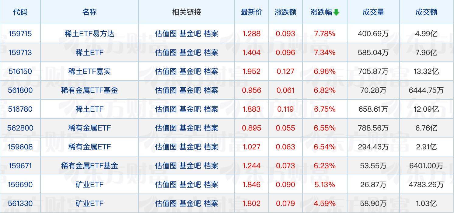 具体来看,稀土永磁板块持续走强,银河磁体、中国稀土、北方稀土等多股涨停,稀土相关ETF集体走强,最高涨7.78%。