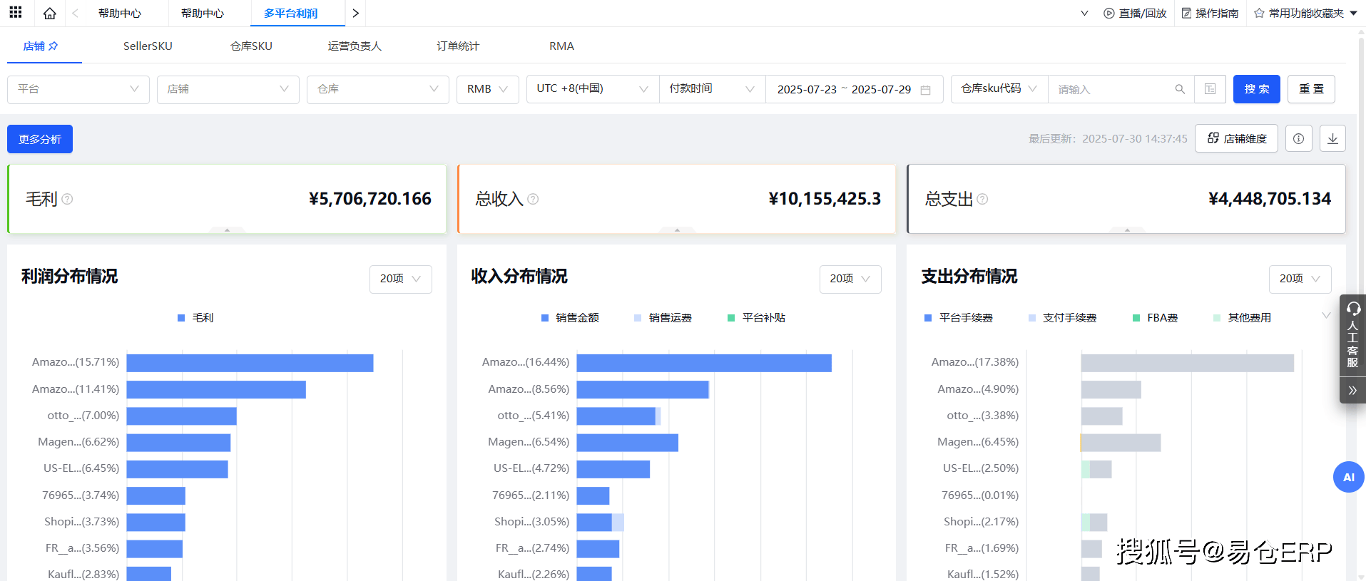 随着业务向多市场、多平台扩展,跨境电商的运营管理复杂度也会增加。这时,专业的跨境电商ERP可以提供必要的支持。以易仓ERP为例,这款跨境电商ERP能够帮助卖家统一处理来自不同跨境电商平台的订单,协调多个海外仓库的库存调配,并将业务数据与财务系统对接。易仓ERP还提供广告投放效果的分析功能,帮助卖家了解各跨境电商平台的广告表现。此外,通过易仓ERP多平台利润功能,卖家可以查看在各个跨境电商平台的销售利润情况,了解不同商品的盈利表现。
