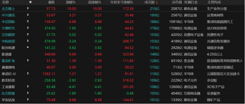 市场亏钱效应明显。个股跌多涨少,共计1684只个股收涨,涨停股73只;3634只个股收跌,跌停股10只。今日成交额超过100亿元的个股共计15只,北方稀土放量涨停,中芯国际收涨6.66%报136.47元/股,华友钴业收涨8.68%报70.48元/股。