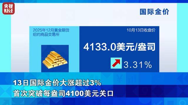 贵金属方面,受美国白宫近日有关加征关税言论、美国联邦政府“停摆”持续,以及市场预计美联储未来将多次降息等因素推动,国际金价周一大涨超过3%,首次收于每盎司4100美元关口上方。截至收盘,纽约商品交易所12月黄金期价收于每盎司4133.0美元,涨幅为3.31%。