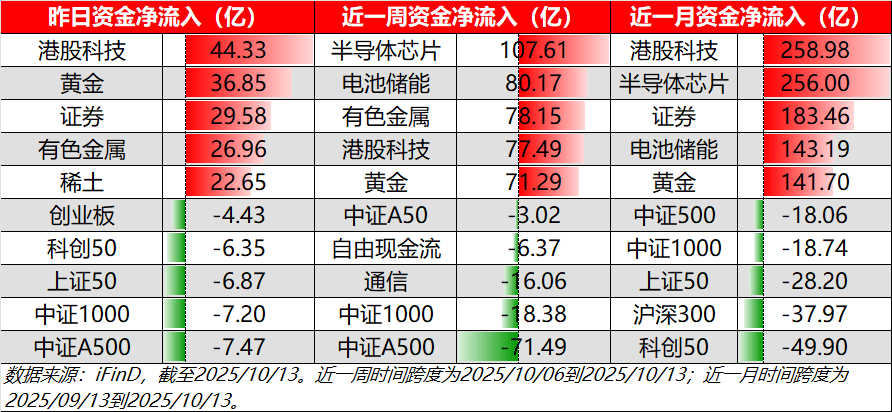 从日、周、月三重维度上看,港股科技和黄金延续资金青睐,三重维度上资金净流入均位居前五,近一月资金净流入分别达258.98亿和141.70亿。