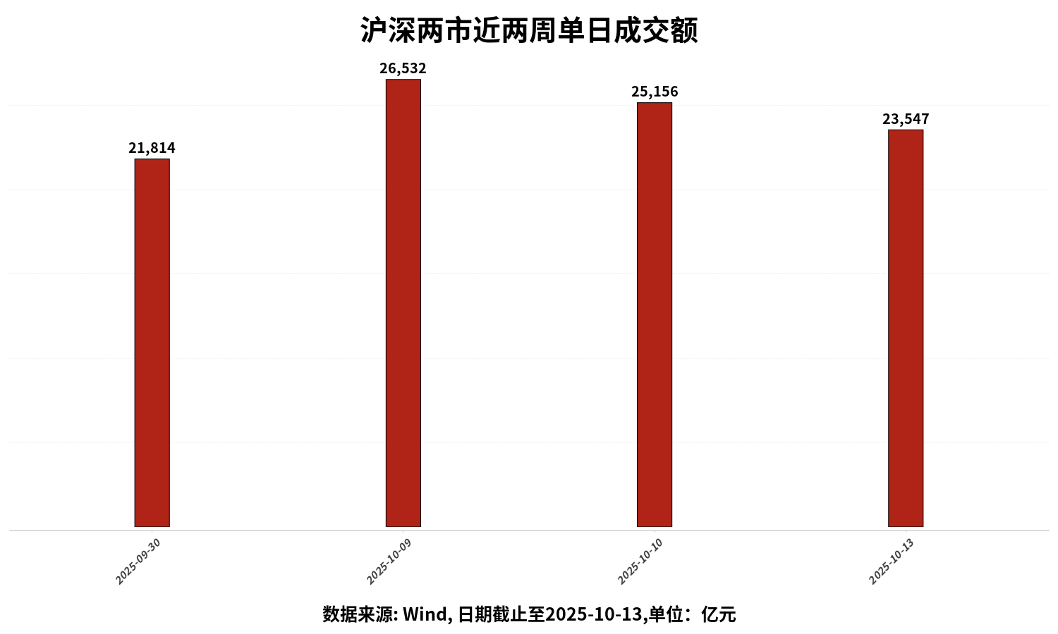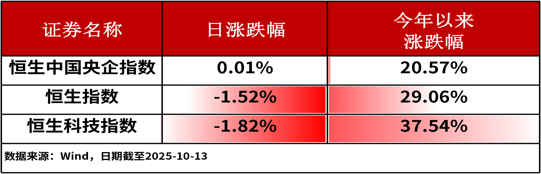 10月13日,A股三大股指全线下跌,上证指数微跌0.19%,深证成指下跌0.93%,创业板指下跌1.11%。主流宽基指数中,科创50指数上涨1.40%,涨势明显。全市场仅1,680余只股票上涨。港股主流指数涨跌不一。其中,恒生中国央企指数微涨0.01%。市场整体表现疲软,科技板块领跌。沪深两市成交额为23547亿元人民币,相较上个交易日小幅缩量。融资余额达24279亿元,小幅下降。