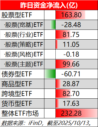 昨日ETF市场整体呈现资金净流入态势,净流入额达232.28亿元。其中股票型ETF和跨境型ETF为净流入主力,分别达163.80亿元和82.70亿元。债券型ETF是昨日唯一呈现资金净流出的大类ETF资金,净流出额达60.71亿元。市场风险偏好相对较高,资金有全球化布局倾向。